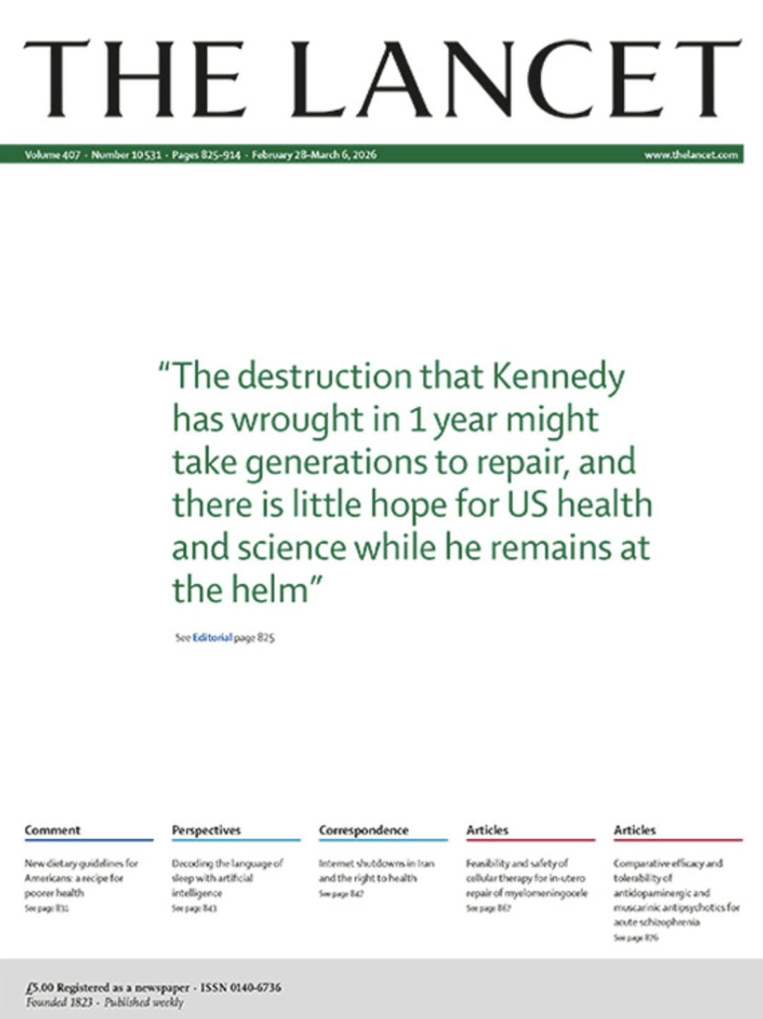 柳叶刀认为,在肯尼迪的主导下,保障美国国家安全的公共卫生体系正在被削弱。国会必须履行监督职责,追究肯尼迪的执政责任。