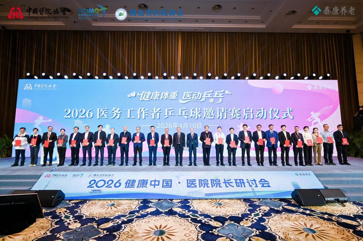 在健康中国战略实施十周年的重要节点,为深入贯彻《“健康中国2030”规划纲要》精神,落实全民健身国家战略,进一步加强医务人员身心健康保障,4月10日,“健康体重·医动乒乓”医务工作者乒乓球邀请赛启动仪式,在2026健康中国·医院院长研讨会上隆重举行。会上正式成立全国赛事组委会,中国医院协会常务副会长毛群安为启动仪式致辞,并颁发组委会委员证书,全国24家省级医院协会会长带队出席本次启动仪式。